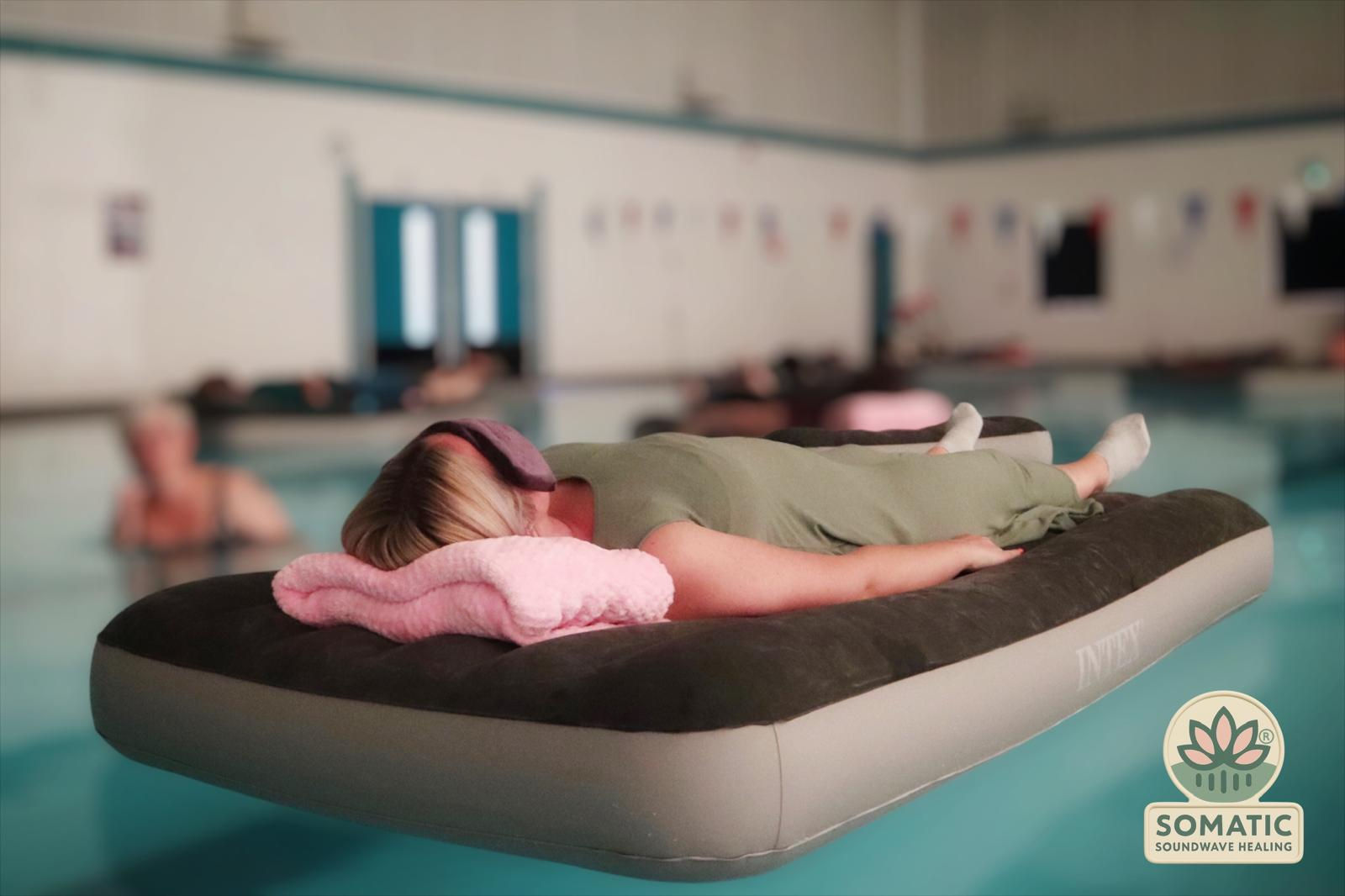 You will be sent an arrival time/address and met in the reception area next to our banner. Please arrive 5 minutes before the start time for the 5 minute Health & Safety Briefing which takes place in the pool changing area. You will be led poolside, fully clothed and shown to our Resting Space whilst listening to meditation music. Staff will give you a demonstration of how to get on and off the Airbed and then you will be guided onto the Airbed whilst listening to our exclusive Somatic Soundwave audio, accompanied by Singing Bowls and other live instruments. Once everyone is settled, a short guided meditation will lead you into a rested state accompanied by our live Soundwave Healing for approximately 70 minutes on the water. The session will finish with a grounding meditation where guides will assist you off your Airbed